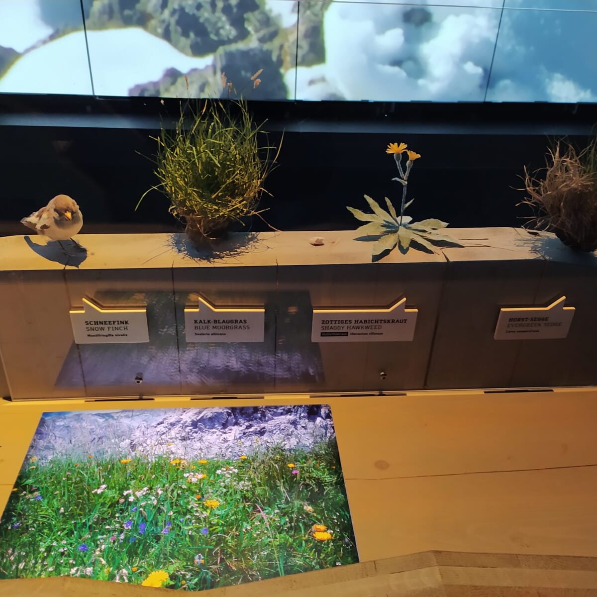 Una volta terminata la visita presso questa sala, ci spostiamo verso l’alto. Un paio di rampe di scale, ed eccoci giunti in una terrazza panoramica situata nell’ultima parte della nostra visita: l’alta montagna. Qui vi sono figure di aquile reali, falchi pellegrini, stambecchi e camosci, anch’essi impagliati come nelle sale precedenti. Ma qui, la vera attrazione non sono gli animali, né tanto meno i resti dei fossili preistorici esposti lungo le pareti. Ciò che cattura maggiormente la nostra attenzione è un enorme pannello 15 metri di larghezza per 8 metri di altezza. Su di esso sono proiettatele immagini e le riprese dei paesaggi e dell’ecosistema del Parco Nazionale. La durata del video di queste immagini è di circa 12 minuti, al termine dei quali, le lamelle dello schermo si aprono e agli occhi del visitatore si aprirà un’incantevole vista delle montagne e del Parco Nazionale di Berchtesgaden.